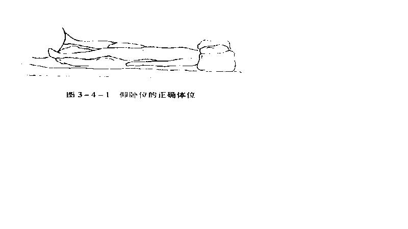 侧卧位:上侧的上肢保持伸展位、下肢屈曲位,肢体下均垫长枕。背后用长枕等靠住,以保持侧卧位(行颅骨牵引时,保持40~60º侧卧)。