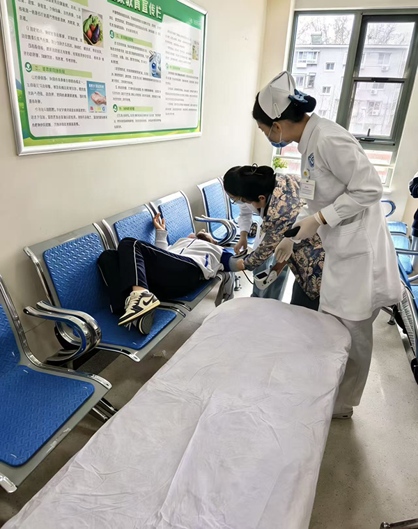 当日10时40分许,我院门诊二层候诊区一名19岁神经内科就诊患者突发呼吸急促、脸色苍白、浑身瘫软,躺倒在候诊椅上,陪同人员惊慌失措,立即向工作人员求助。导诊员张瑶立即呼叫神经内科诊室刘永红医生到场查看、测量生命体征,并通知采血室护士王晓霞。医护人员迅速准备好平车,同时联系急诊开通绿色通道。刘永红医生、王晓霞护士与保安杨向平相互配合,快速、平稳、安全地将患者转运至急诊室。
